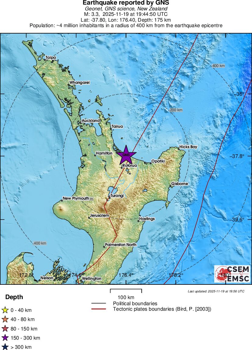 | 3.3 | 175.3 | 7549 | 12:44 | Enlace | Terremoto pequeño- NORTH ISLAND OF NEW ZEALAND - Hoy |