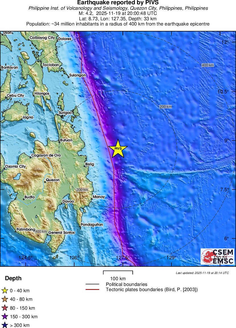 | 4.2 | 33 | 7603 | 13:00 | Enlace | Terremoto ligero- PHILIPPINE ISLANDS REGION - Hoy |