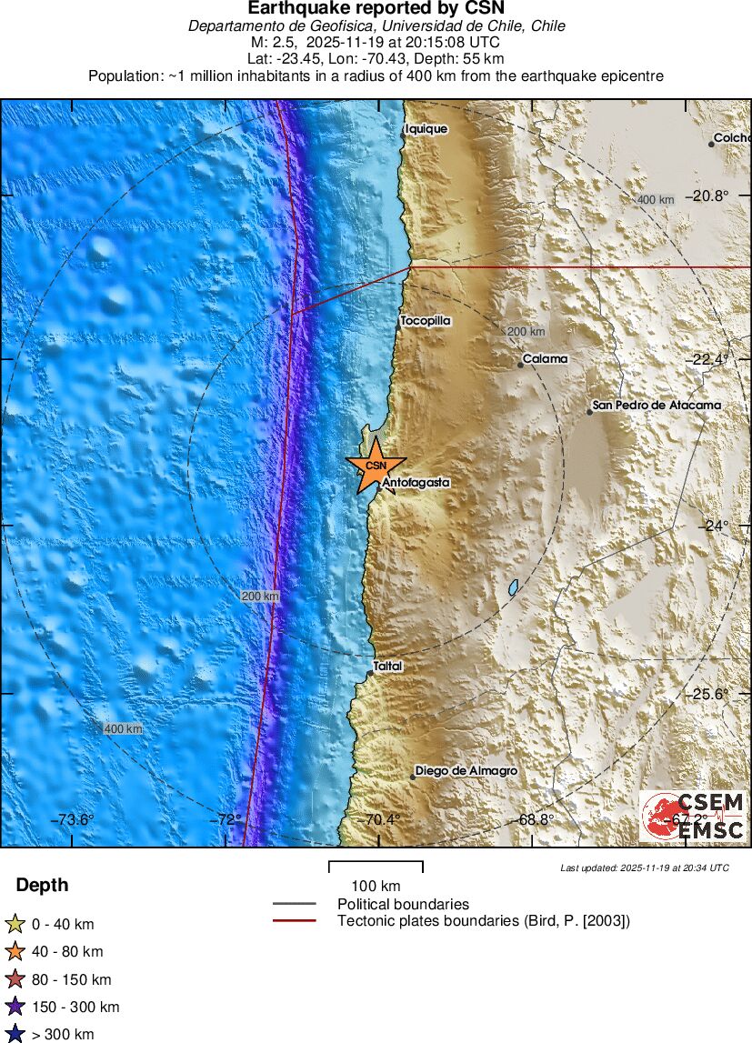 | 2.5 | 54.6 | 5116 | 13:15 | Enlace | Terremoto pequeño- ANTOFAGASTA, CHILE - Hoy |