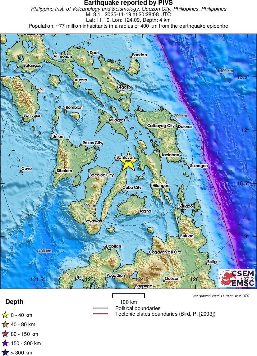 | 3.1 | 4 | 7598 | 13:28 | Enlace | Terremoto pequeño- LEYTE, PHILIPPINES - Hoy |