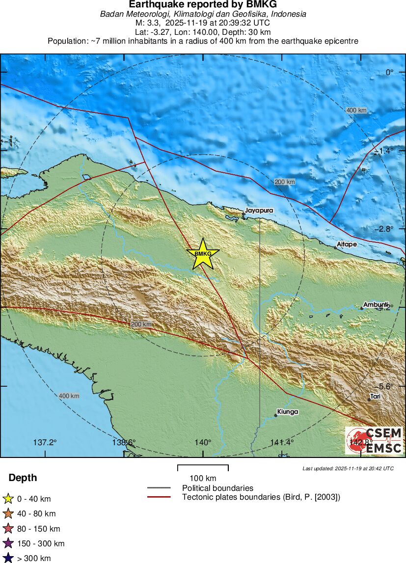 | 3.3 | 30 | 7676 | 13:39 | Enlace | Terremoto pequeño- PAPUA, INDONESIA - Hoy |