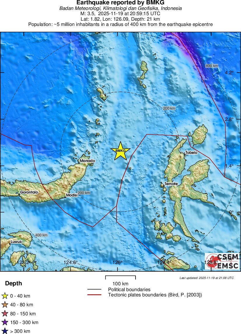 | 3.5 | 21 | 8037 | 13:59 | Enlace | Terremoto pequeño- MOLUCCA SEA - Hoy |