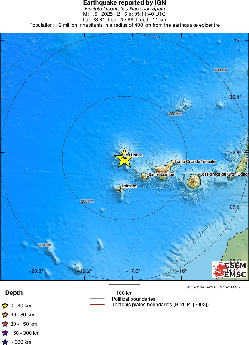 | 1.5 | 11.3 | 4666 | 22:11 | Collegamento | Terremoto minore- CANARY ISLANDS, SPAIN REGION - Ieri |